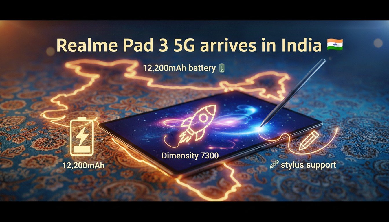 Realme Pad 3 5G arrives in India ๐ฎ๐ณ: 12,200mAh battery ๐, Dimensity 7300 ๐, and stylus support ๐๏ธ