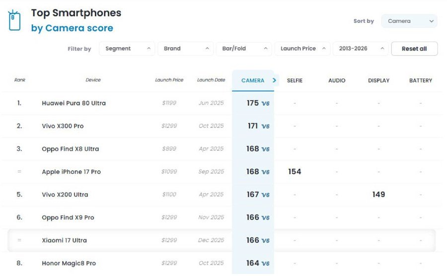Regarding the competition, the Xiaomi 17 Ultra didn’t manage to unseat the Huawei Pura 80 Ultra from the top of the rankings 🏁. Nevertheless, it successfully outperformed several high-profile heavy hitters 🥊, including the Honor Magic 8 Pro, the Google Pixel 10 Pro XL, and the iPhone 16 Pro Max 🌟.